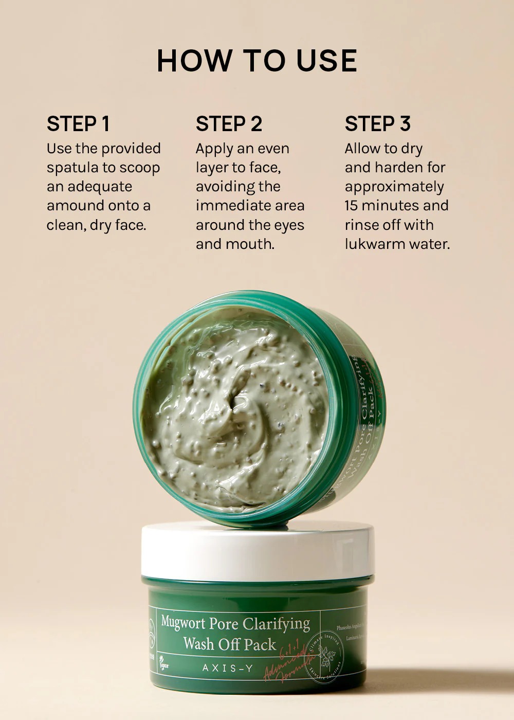 ضعي طبقة متساوية على الوجه بعد تنظيفه، اتركي القناع لمدة 10–15 دقيقة، ثم اشطفي بالماء الفاتر. يُستخدم 1–2 مرات أسبوعيًا حسب الحاجة.